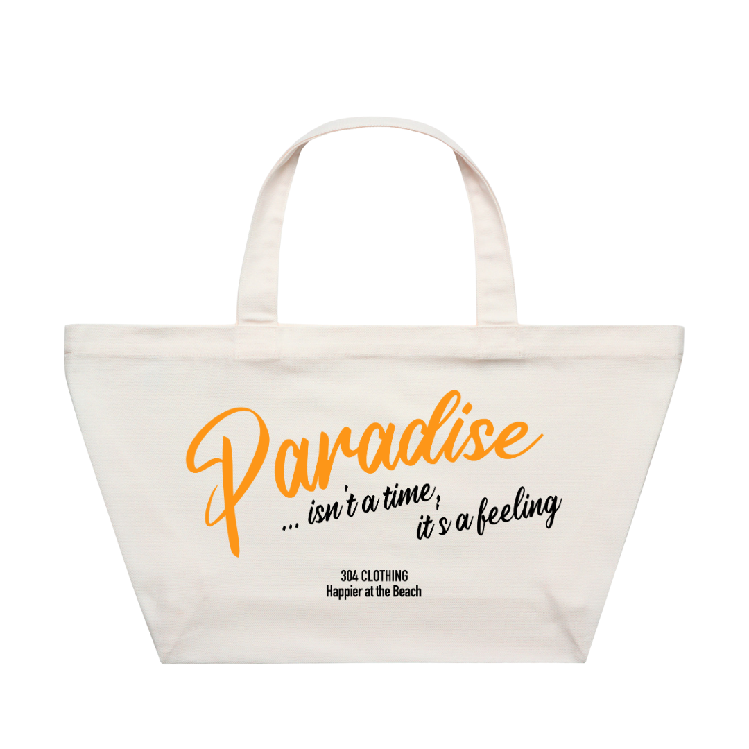 Sunshine state of mind. The Paradise Oversized Tote is built for beach days, market runs, or anything in between — featuring a clean canvas base with tropical script graphic and orange pop print. Soft but structured with wide straps and a deep body to carry it all.