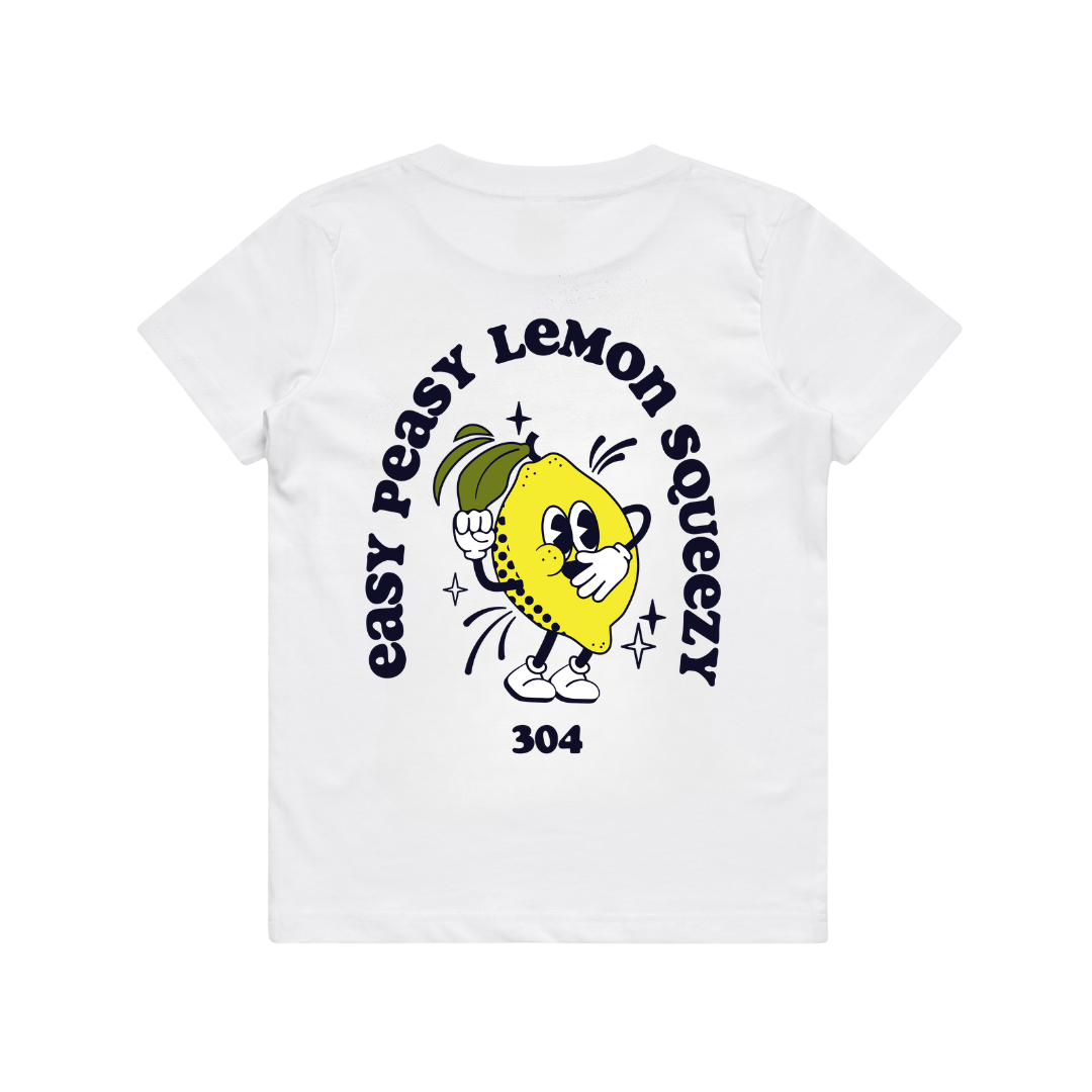 It’s preshrunk and kid-proof, finished with a clean 304 front hit and a bold back print featuring your new favourite lemon.