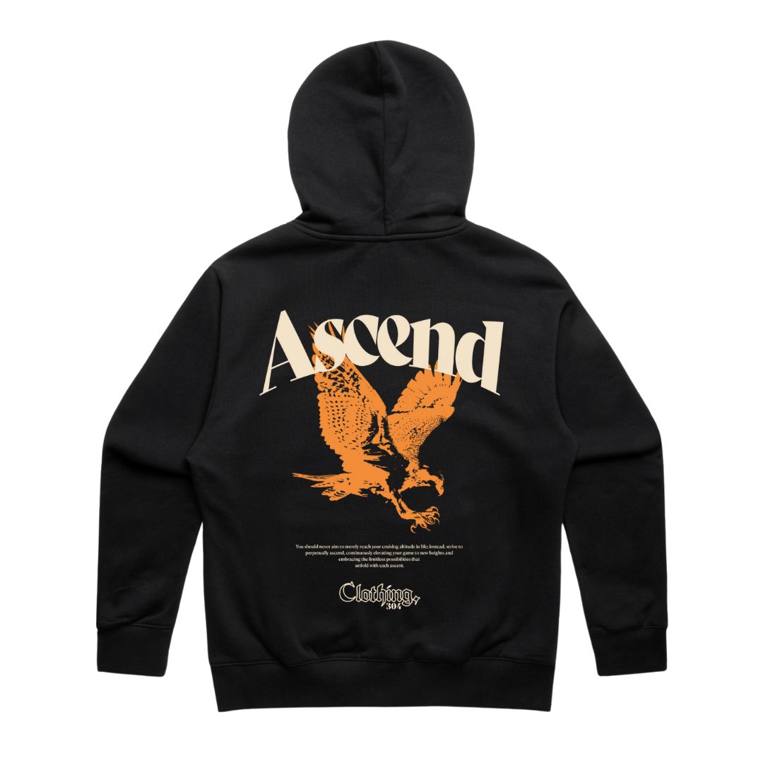 Details include inset sleeves, a self-lined hood, and durable 2×2 ribbing on the cuffs and hem. The premium two-way YKK zip allows easy layering, while the bold printed back graphic — featuring a soaring eagle and the word Ascend — captures the spirit of rising again, stronger each time. Finished with clean printed branding on the front.