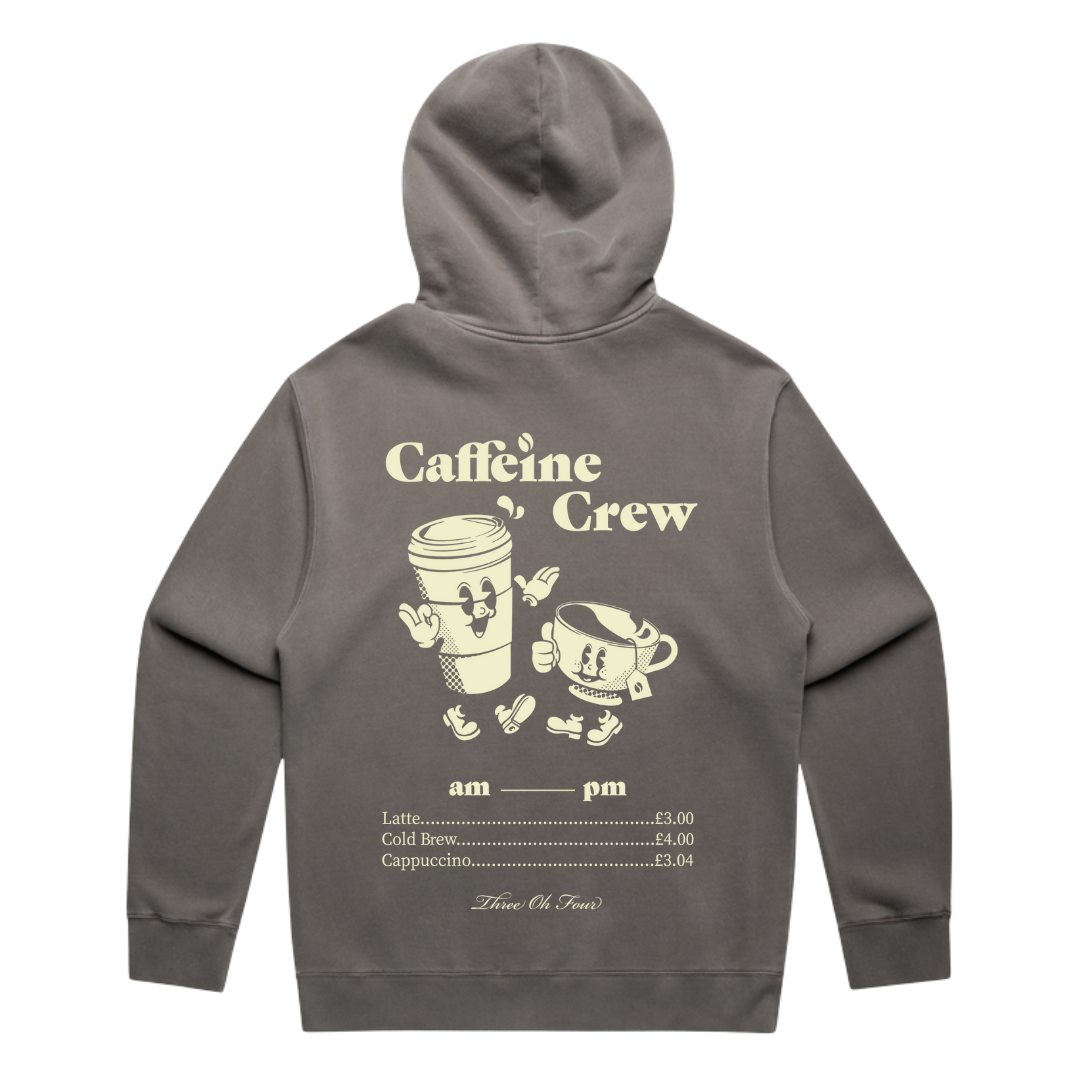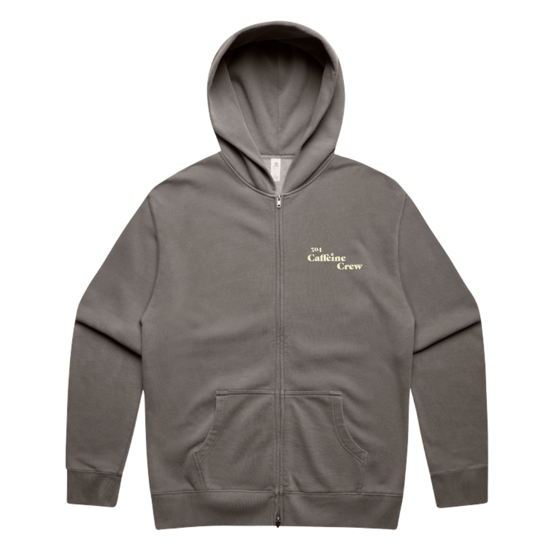 The full-length YKK zip adds versatility, while the kangaroo pocket keeps things practical. Finished with our signature “Caffeine Crew” printed artwork front and back—fuel your day, your way.