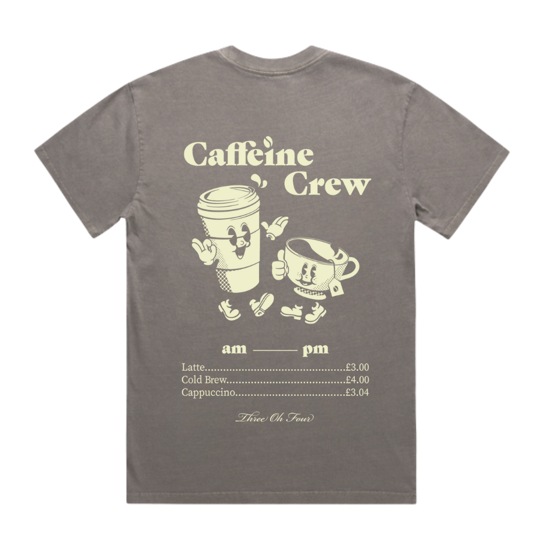 The front keeps it low-key with “304 Caffeine Crew” branding, while the back brings the buzz — animated coffee characters and a nostalgic coffee shop price list for that all-day grind energy.