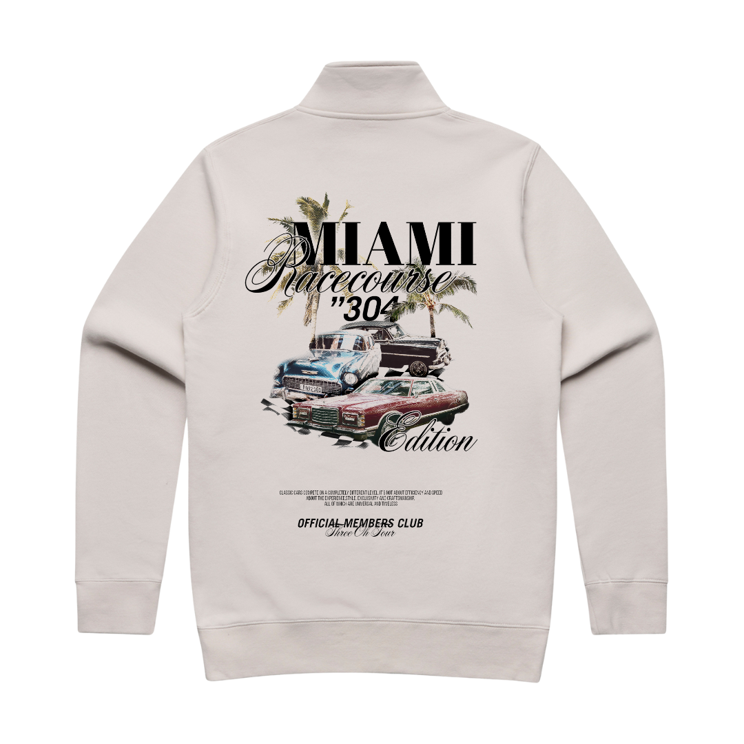 A clean cut with a motorsport twist. This bone mid-heavy fleece half zip comes with a mock neck, ribbed cuffs and silver zip detail. Stamped with Three Oh Four – Official Members Club on the chest and a bold back graphic: Miami Racecourse ‘304 Edition’.