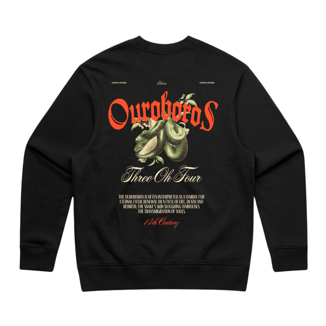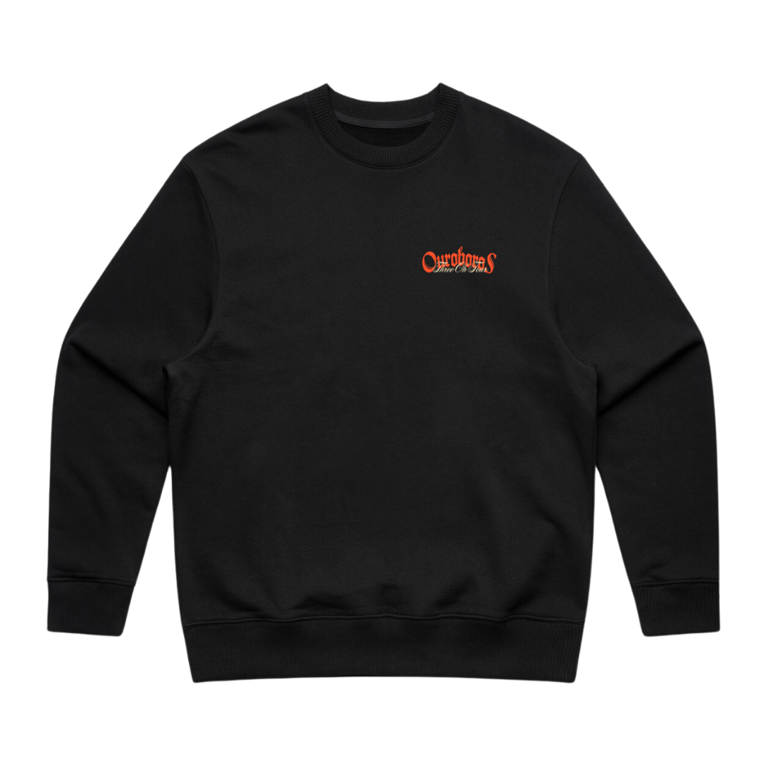 A heavyweight crew with a small logo on the front and large Ouroboros print on the back. Crafted from 400 GSM brushed fleece for unmatched warmth and comfort. This oversized fit features dropped shoulders, inset sleeves, and ribbed cuffs, hem, and neckline.