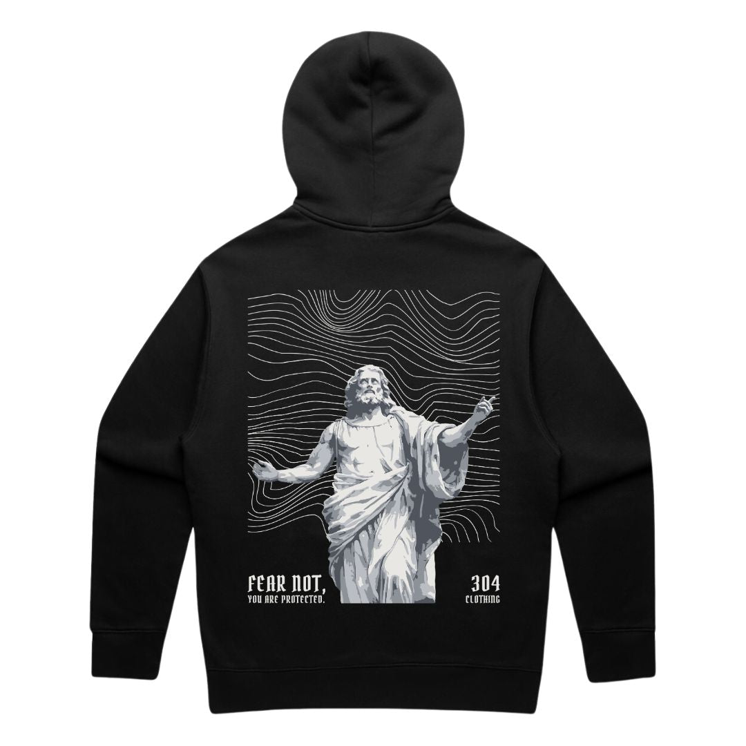 The back features a striking printed graphic of a protective figure, surrounded by flowing lines and anchored by the words: “Fear Not, You Are Protected.” A matching front print keeps the message close to heart.